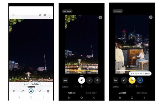 <体験概要> ホーム画面のウィジェットにある「オーディオ消しゴム」をタップします。屋外でピアノを弾いている動画から、AIが4つの音に分類。風の音やノイズ音を調整し、思い通りの音源の動画に完成させる操作を見ることができます。