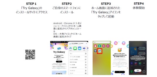 『Try Galaxy』は、Samsung Galaxyスマートフォンをお持ちでないお客様でも、お手持ちのスマートフォンで指定のQRコードをスキャンしホーム画面にショートカットを追加するだけでインストールが完了。いつでもどこでも、Samsung GalaxyのOSや各種アプリ、カメラ機能などをバーチャルでお楽しみいただける無料アプリです。