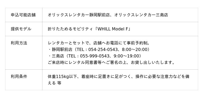 WHILL株式会社(本社:東京都品川区、代表取締役社長 CEO:杉江理、以下「WHILL社」)は、免許・ヘルメット不要で歩行領域を走行する近距離モビリティWHILL(ウィル)のレンタルサービスが、鈴与商事株式会社(本社:静岡市、代表取締役社長:伊藤正彦、以下「鈴与商事」)の子会社でレンタカー事業を展開する鈴与レンタカー株式会社(以下「鈴与レンタカー」)で開始されることを発表いたします。高齢化や多様化、旺盛なインバウンド需要などを受け、観光の仕方やニーズも多岐に広がる中、お出かけ機運が一層高まる秋の行楽を機に、主要駅からレンタカーで出向いた目的地でも、持ち運んだウィルで快適に観光を満喫できるシームレスな移動環境を整備し、より自分らしく満足度の高い旅のひとときを提案します。本サービスの提供は東海地域のレンタカー会社としては初となります。