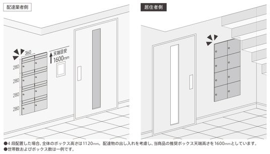 2024年に発売した前入前出・住戸別宅配メイルボックス「GMX-1」と同様に本体高さを280mmとし、三辺70cmまでの荷物を収納できるサイズを確保するとともに納まりの施工性に配慮しました。