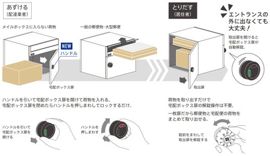 業界初※1となる暗証番号設定不要・電源を使わない専用の機械式錠前を新規に採用することで、配達業者が共用部の屋外側から荷物を配達し施錠、オートロックエリア等の屋内側から居住者が荷物を取り出せる前入後出タイプの宅配ボックス付きメイルボックスという、これまでにない新しい商品ジャンルを創出しました。