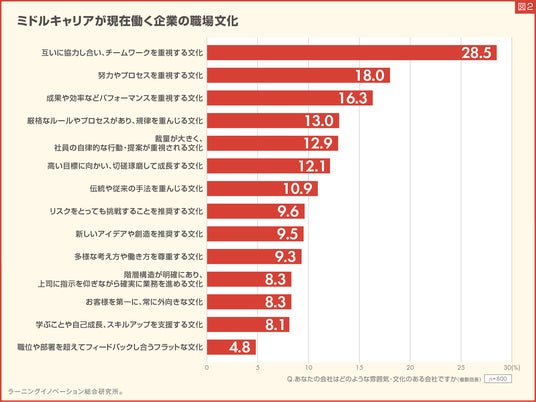 2. ミドルキャリアが現在働いている職場の文化、「チームワークを重視する文化」が最大に