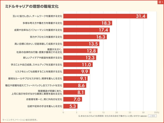 1. ミドルキャリアが理想とする職場の文化、「チームワークを重視する文化」が最大に