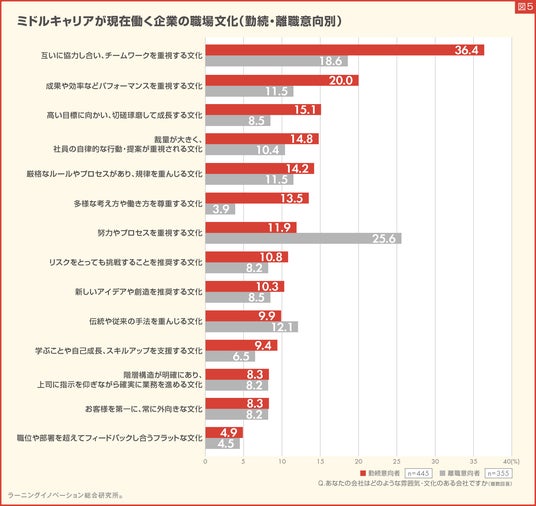 一方、離職意向者の現在の職場文化は、「努力やプロセスを重視する文化」が25.6%と最大となり、次に、「互いに協力し合い、チームワークを重視する文化」(18.6%)、「伝統や従来の手法を重んじる文化」(12.1%)と続きました。(図5)