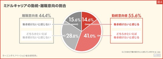 「働き続けたいと感じる」「どちらかといえば働き続けたいと感じる」と回答した人を勤続意向者、「どちらかといえば働き続けたいと感じない」「働き続けたいと感じない」と回答した人を離職意向者として分類すると、勤続意向者は55.6%、離職意向者は44.4%の割合となりました。(図4)