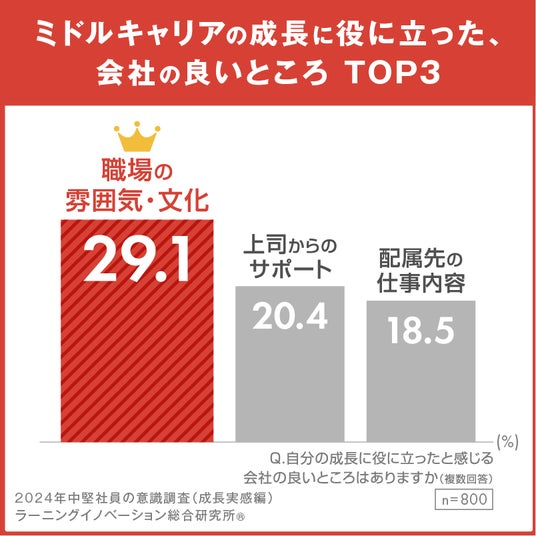 「育成の空白地帯」といわれる中堅社員は、既に経験豊富で自立していると判断され、指導や育成に対する優先度が低くなりがちです。当社が中堅社員に実施した調査結果(*2)によると、中堅社員の成長に役に立った会社の良いところとして、「職場の雰囲気・文化」が2年連続トップに挙がりました。このことからも、中堅社員は「職場の雰囲気・文化」に支えられて働いていることが推察できるでしょう。