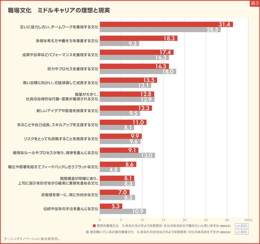 なお、現在働いている職場文化と、理想とする職場文化を比較したところ、理想よりも現実の割合が低かった項目は「多様な考え方や働き方を尊重する文化」「職位や部署を超えてフィードバックし合うフラットな文化」などとなりました。「伝統や従来の手法を重んじる文化」「厳格なルールやプロセスがあり、規律を重んじる文化」は、理想と異なると捉えられている傾向も明らかとなり、近年のミドルキャリアは、従来のルールや方法論に縛られるのではなく、世の中の動きに対して柔軟に対応する文化を好む傾向にあることが見受けられました。