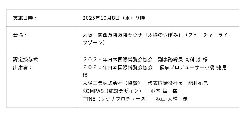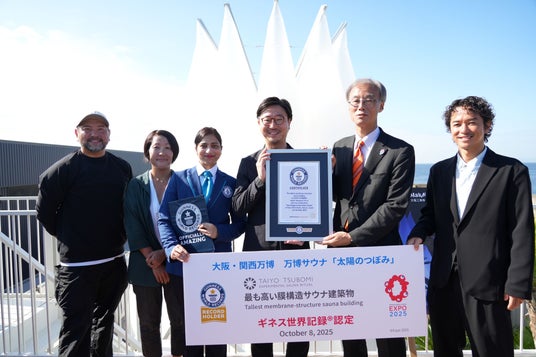 大型膜面構造物(テント構造物)や土木・物流資材などを手がける太陽工業株式会社(東京本社:東京都世田谷区、大阪本社:大阪市淀川区、代表取締役社長:能村 祐己、以下:太陽工業)が、2025年日本国際博覧会(大阪・関西万博)の主催者催事におけるシルバーパートナーとして協賛する万博サウナ「太陽のつぼみ」は、最も高い膜構造サウナ建築物(Tallest membrane-structure sauna building)として、2025年10月8日(水)にギネス世界記録(TM)へ認定されました。同日、認定員立ち会いのもと公式認定証授与式が行われました。
