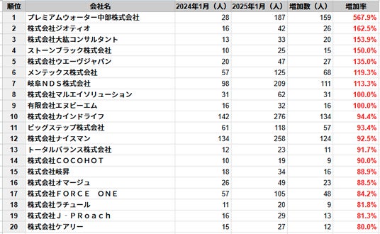「誰もが活躍できる仕組みをつくる。」をミッションに掲げ、セールスチームの武器となるデータベース「SalesNow」を展開する株式会社SalesNow(本社:東京都渋谷区、代表取締役:村岡功規、以下「SalesNow」)は、国内550万社の企業情報を完全網羅した日本最大級のデータベース「SalesNow DB」より、岐阜県に本社を置く企業の2024年1月時点および2025年1月時点の従業員数データを分析し、従業員数増加率ランキングTOP20を発表しました。本ランキングは、各企業の成長スピードを可視化するものであり、新規雇用の創出や事業拡大の動向を明らかにしています。