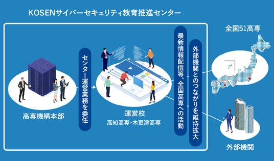 これまで高専の行ってきたサイバーセキュリティ教育を更に高度化し、以下の取組を中心に、これからのサイバー空間とフィジカル空間が融合した社会に求められる人材の育成に貢献するため、高専機構本部にKOSENサイバーセキュリティ教育推進センターが設置され、木更津高専と高知高専が運営校となっています。