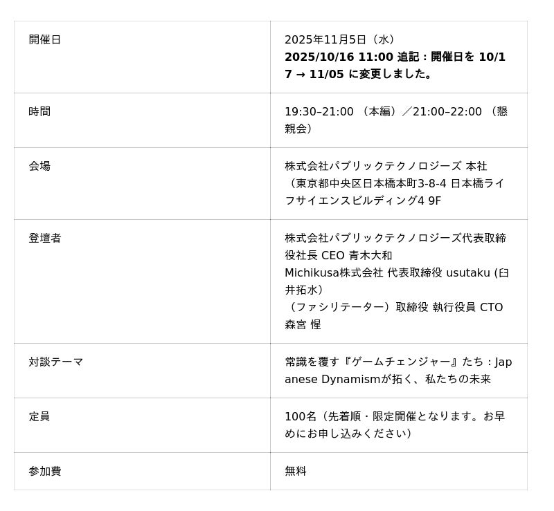 地方自治体向けスーパーアプリ「パブテク」やAIを活用した行政支援ツール「パブテクAI行政」を開発・運営する株式会社パブリックテクノロジーズ(本社:東京都中央区、代表取締役社長 CEO:青木大和、以下「当社」)は、2025年10月17日(金)、公開対談イベント第2回「パブテクアカデミー」を開催します。