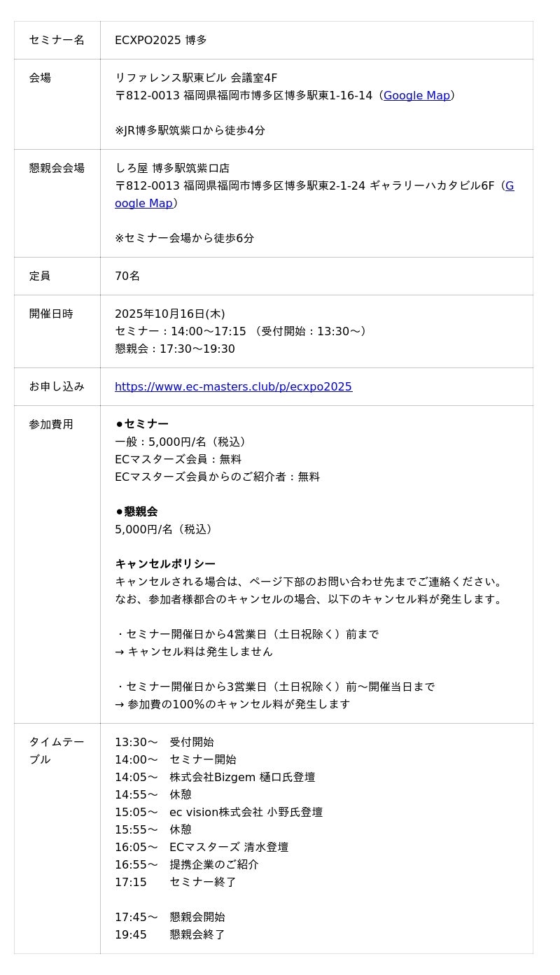 楽天市場などモール出店企業向け会員制サポートサービス『ECマスターズクラブ』を運営する日本ECサービス株式会社(本社:東京都渋谷区 代表取締役:清水将平)は、『ECXPO2025 博多』を2025年10月16日(木)に開催します。