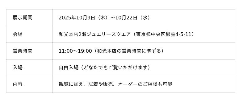 ※「ジュエリーで感じる日本の美意識 ーWA美ー」の会期は2025年10月2日(木)~15日(水)、大倉堂の展示は10月9日(木)~22日(水)と、期間が一部異なります。