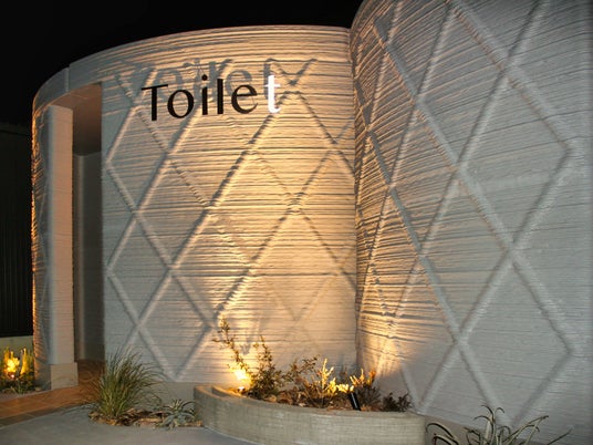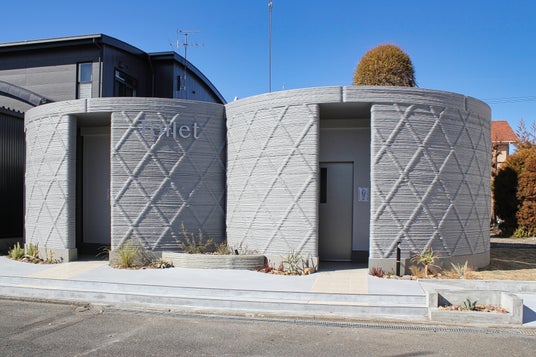 SBSマイホームセンター静岡展示場に完成したトイレ建屋。外壁に3Dプリンターで出力したコンクリートパネルを使用している。