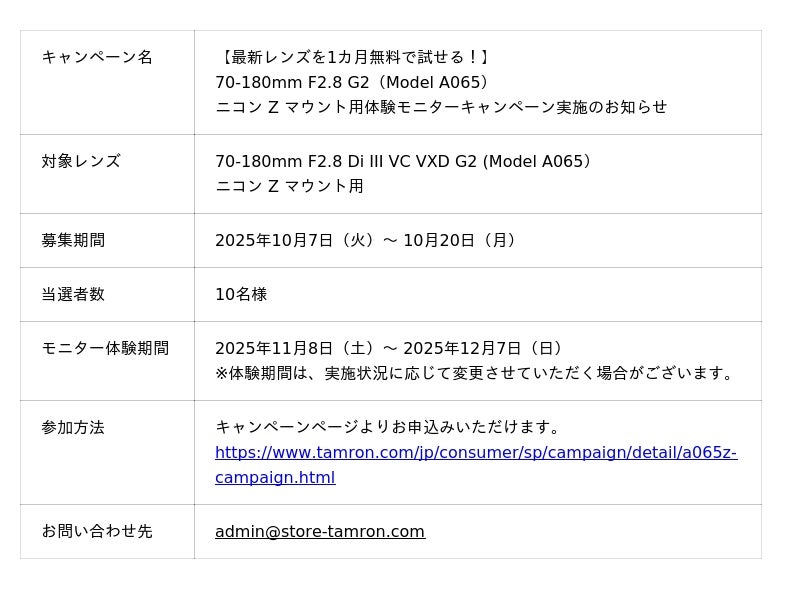 総合光学機器メーカーの株式会社タムロン(本社:さいたま市)は、フルサイズミラーレス一眼カメラ対応ニコン Z マウント用望遠ズームレンズ「70-180mm F2.8 Di III VC VXD G2(Model A065)」の発売を記念して、体験モニターキャンペーンを実施いたします。
