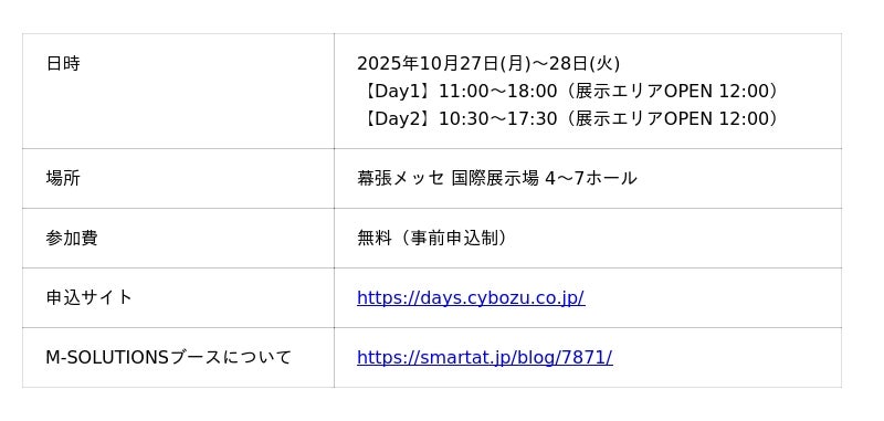 M-SOLUTIONSは、2025年10月27日(月)・28日(火)に幕張メッセで開催されるサイボウズ主催の「Cybozu Days 2025」にて本サービスを出展いたします。終日kintone×AIサービスの活用に活かせるブースセミナーを開催し、M-SOLUTIONSの提供するSI・自治体DXや、kintoneに簡単に30種類以上の機能を追加できる「オプション・ワンプラグイン」などを展示予定です。kintoneを使ったAI活用等にご興味ある方は弊社ブースまでお越しください。
