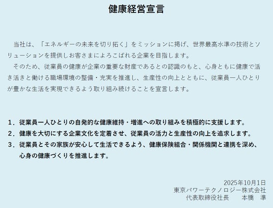 エネルギー分野を中心に幅広い事業を展開する東京パワーテクノロジー株式会社(本社:東京都江東区、代表取締役社長 本橋準、以下当社)は、このたび「健康経営宣言」を公表するとともに、3つの基本方針を掲げましたので、お知らせいたします。