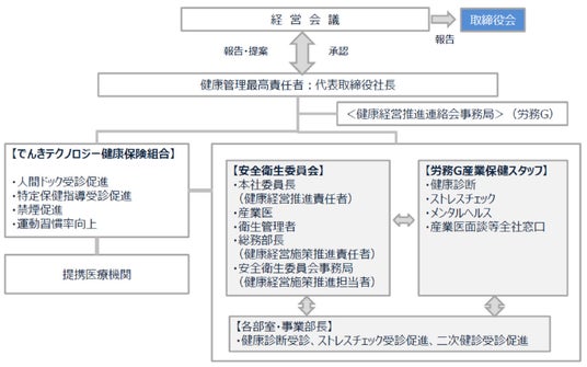 代表取締役社長を最高責任者とし、健康保険組合をはじめ関係機関と連携を図り、全社一体