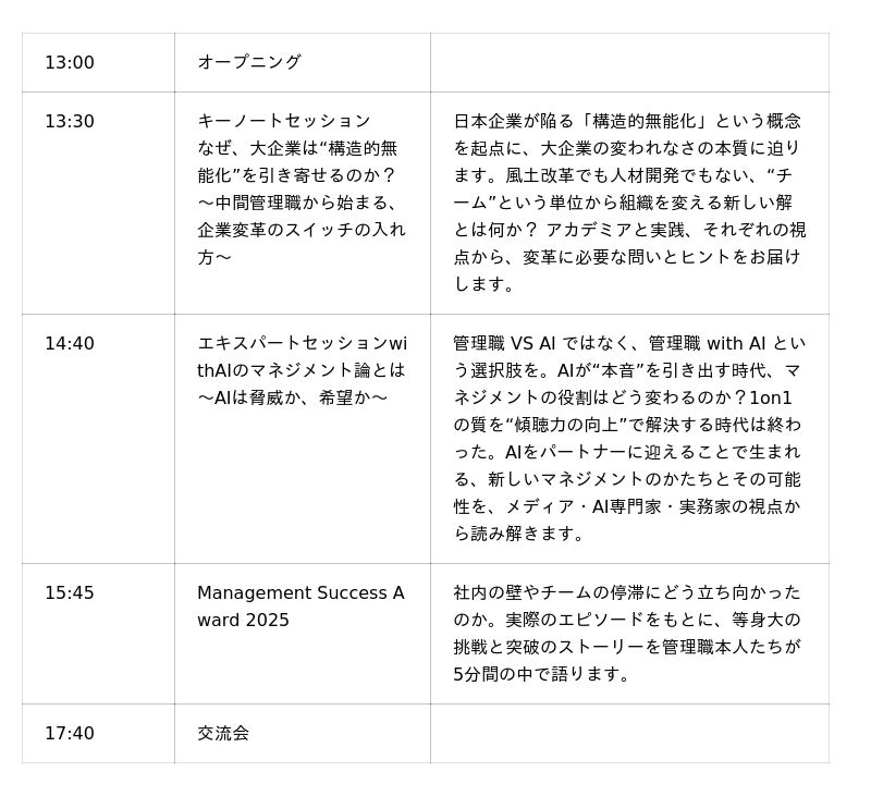 AIと歩むマネジメントの新しいかたちと組織変革のストーリーがわかる人事向けイベント「Management Success Summit 2025~AIは脅威か?希望か?~」を開催