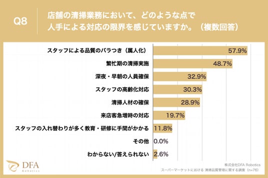- Q8:店舗の清掃業務において、人手による対応の限界を感じている点を教えてください。(複数回答)