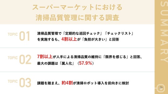 調査結果と共にスーパーマーケット運営の実態および清掃ロボット導入について「スーパーマーケットにおける清掃品質管理に関する意識調査レポート」を発表したことをお知らせいたします。
