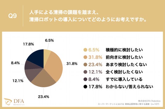 - Q9:人手による清掃の課題を踏まえ、清掃ロボットの導入についてどのようにお考えですか。