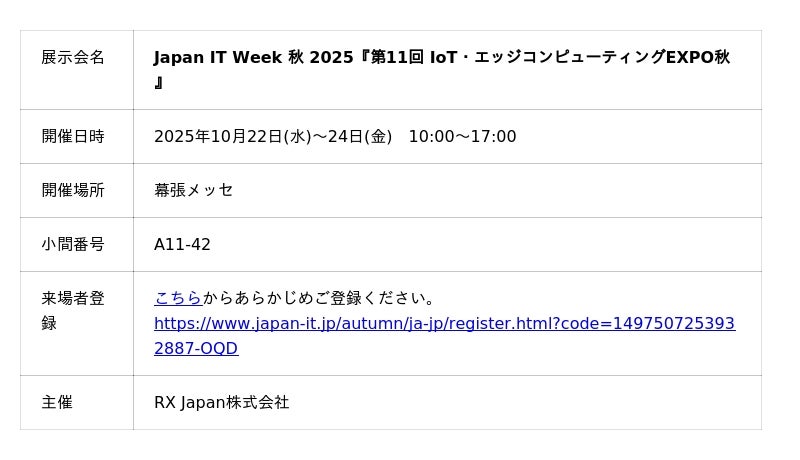 株式会社Braveridge(ブレイブリッジ、本社:福岡県福岡市西区、代表取締役社長 小橋泰成、以下Braveridge)は、2025年10月22日(水)~24日(金)に幕張メッセで開催される「第11回 IoT・エッジコンピューティングEXPO【秋】」に出展いたします。