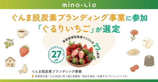 GNホールディングス株式会社(本社:群馬県前橋市、代表取締役社長 天野慎太郎、以下「GNホールディングス」)傘下の農業法人株式会社mino-lio(ミノリオ)(本社:群馬県高崎市 代表取締役社長 天野洋一、以下「mino-lio」)は、このたび群馬県が推進する「ぐんま脱炭素ブランディング事業」に参加し、自社商品の「ぐるりいちご(150g)」に対して「デカボスコア」を導入。従来品と比較して、いちご150gの原材料調達から廃棄までにおけるCO2e排出量27%削減(デカボスコアCO2e 27%オフ)を可視化し、お客様とともに環境への貢献を進めてまいります。