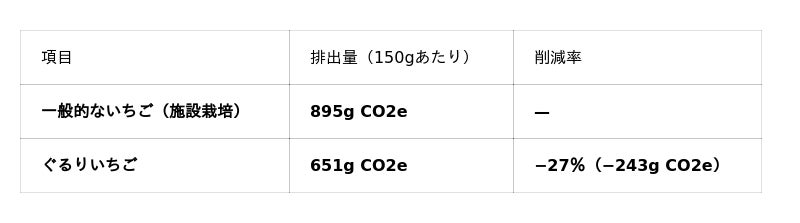 「ぐるりいちご(150g)」は、原材料調達から製造・流通・消費・廃棄までのライフサイクル全体におけるCO2e排出量を評価した結果、