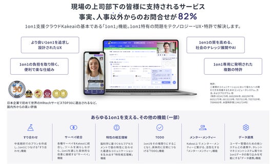 1on1ツールKakeaiは、複数の特許やAI・テクノロジー、また数十万人のKakeaiユーザーが日々実施する1on1のデータを活かし「現場の上司部下、および経営・人事の皆様の1on1にかかる負担を減らしつつ、質の高いコミュニケーションを生み出すツール」です。従業員数名の企業から数万人の企業、病院、学校、保育園、介護施設、飲食店等、あらゆる業種・職種の皆様にご利用いただいています。