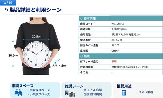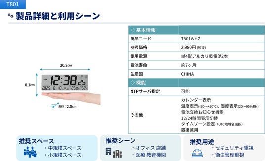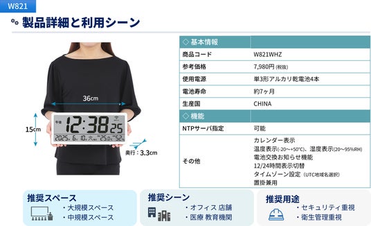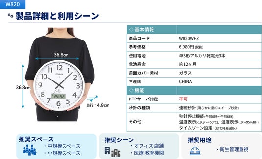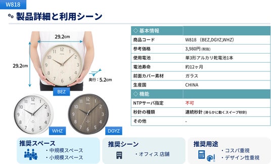 2024年秋の前モデル発売後、企業法人様から「より大きな文字盤が欲しい」「ガラス以外の素材を希望」「デザイン性を高めて欲しい」といった声が寄せられました。これを受け、ノア精密は新たに10モデルをラインナップし、「時刻の正確性」と「現場ニーズの多様化」双方を満たす「無線LAN時計」を提供いたします。
