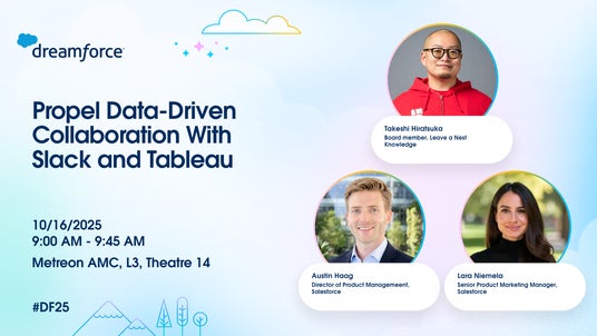 セッション内容: Tableau NextとSlackの統合により、組織のサイロを打破し、リアルタイムでデータに基づいた意思決定を行う事例を紹介します。Director of Product ManagementであるAustin Haag氏、Senior Product Marketing ManagerであるLara Niemela氏とともに、「ナレッジが踊るように開放される」組織文化の構築と、AIパワードインサイトな機能を活用した次世代のコラボレーション手法について、実際の導入事例をもとに解説いたします。