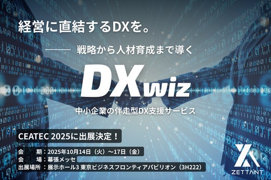 株式会社ゼタント(本社:東京都、代表取締役:久保健)は、中小企業のDXを戦略から実装・定着まで伴走する包括支援パッケージ 「DX wiz(DXウィズ)」 のサービス提供を開始します。この新サービスは、2025年10月14日(火)~17日(金)に幕張メッセで開催される CEATEC2025 にて初公開いたします。