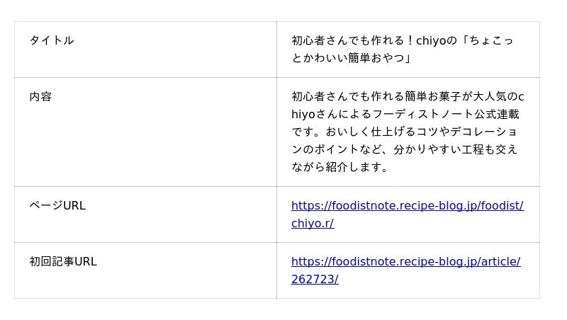 約3万人の「フーディスト(R)(料理インフルエンサー/料理クリエイター/料理家)※」が参加する、日本最大級の料理インフルエンサーネットワーク事業「フーディストサービス( https://foodist-service.jp/ )」を展開するアイランド株式会社(本社:東京都渋谷区、代表取締役:粟飯原理咲)は、運営メディアである、「フーディストノート」にて、「おやつ動画クリエイター」としてブログやInstagramで発信をするchiyoさんによる新連載「初心者さんでも作れる!chiyoの「ちょこっとかわいい簡単おやつ」」をスタートしました。