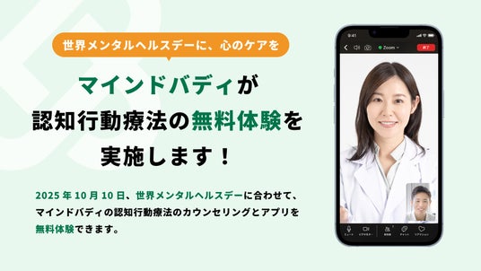 マインドバディ株式会社(本社:東京都、代表取締役:小島康裕)は、2025年10月10日(金)の「世界メンタルヘルスデー」に認知行動療法の無料体験を実施することをお知らせいたします。