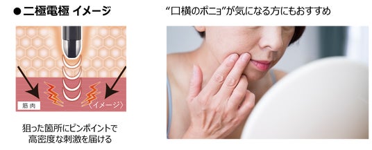 リフトケア*6で重要な表情筋は、実は年齢とともに硬く、動きづらくなる傾向があります。美顔器でケアをしても表情筋が硬いままだと、表面からのアプローチだけでは筋肉の動きが小さく非効率的です。そこでヒントにしたのが電気美容鍼です。電気美容鍼は顔の筋肉に細い鍼を直接刺して電気を流すことで、普段使えていない筋肉を動かしてアプローチしますが、本製品では「押し込み型*7」かつ、先端に「二極電極」を搭載した「ポイントヘッド」により、硬くなった表情筋をピンポイントで刺激し、動かすことが可能になりました。さらに美容成分の浸透*8が期待できるモイスチャーパルス(イオン導入波形)を搭載し、効率的なお手入れを叶えます。
