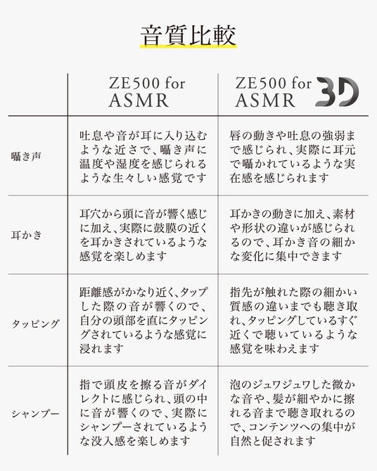 「ZE500 for ASMR 3D」が「近接3D音場」に対応しているのに対し、「ZE500 for ASMR」は「超近接音場」に特化した音質設計を採用。耳元近くに音像が定位することで、まるで自身がダミーヘッドマイクに入り込んだような臨場感を得ることが可能です。コンテンツ毎に2つの製品を聴き比べると下記のような特長となります。