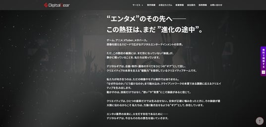 新サイトのトップでは、「ゲーム、アニメ、VTuber」といった急成長するデジタルエンターテインメントの世界を背景に、当社のビジョンである「“エンタメ”のその先へ── この熱狂は、まだ“進化の途中”」を掲げています。企画・制作・運用のすべてをひとつの“ギア”として回し、クリエイティブの未来を支える駆動力を提供するというデジタルギアの想いを表現しました。