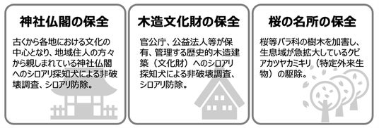 本プロジェクトでは、趣旨にご賛同いただける歴史的木造建築や住民に愛される桜の木などを対象に、シロアリ生息調査と防除施工、クビアカツヤカミキリの駆除施工などを実施する予定です。