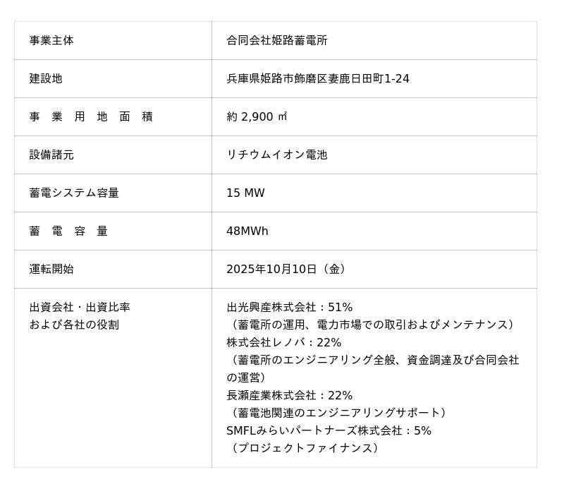 出光興産株式会社(本社:東京都千代田区、代表取締役社長:酒井 則明、以下「出光興産」)、株式会社レノバ(本社:東京都中央区、代表取締役社長CEO:木南 陽介、以下「レノバ」)、長瀬産業株式会社(本社:東京都千代田区、代表取締役社長:上島 宏之、以下「長瀬産業」)、SMFLみらいパートナーズ株式会社(本社:東京都千代田区、代表取締役社長:上田 明、以下「SMFLみらいパートナーズ」)は、共同出資により設立した合同会社姫路蓄電所を通じ開発した「姫路蓄電所」(以下「本蓄電所」)が、 2025 年 10 月 10 日付で運転を開始したことをお知らせいたします。