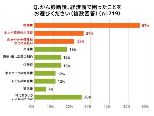 ・がんの診断後、経済面で困った項目は「医療費」が57%、次いで「本人や家族の生活費」27%、「税金や社会保険料などの支払い」22%と多い結果に