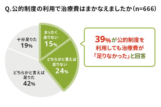 ・「公的制度の利用で治療費がまかなえたか」については、「どちらかといえば足りない」「まったく足りない」と回答した人は39%