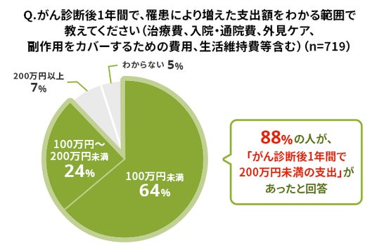 ・がん罹患後1年で増えた支出は200万円未満が約9割を占める