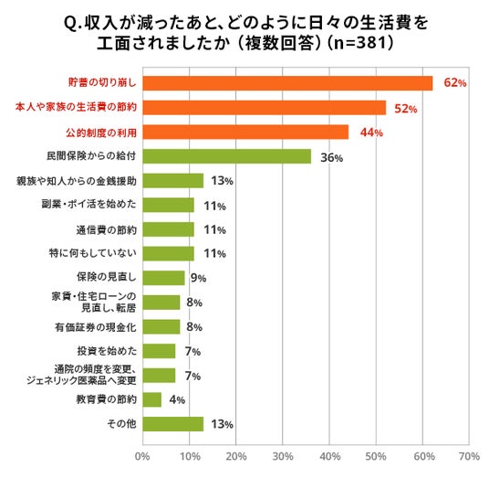 ・収入が減ったあとの生活費の工面は、62%が「貯蓄の切り崩し」。「本人や家族の生活費の節約」が52%、「公的制度の利用」が44%と続く。