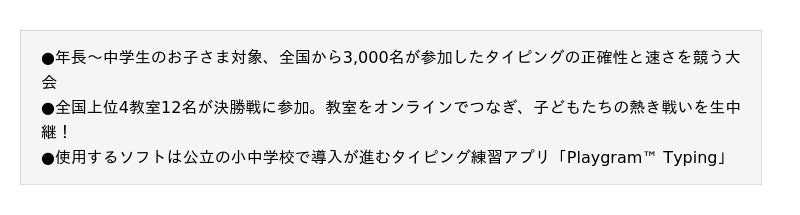 今年の「タイピングチャレンジカップ」は8月5日~8日の「タイピングキャンプ」、8月8日~8月31日までの「タイピングコンテスト(予選)」と教室対抗の「タイピングコンテスト(決勝)」という3部構成で実施されました。