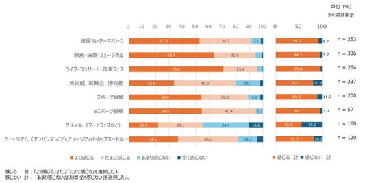 イベントで「没入感」を感じる頻度を「感じる 計」で見ると、「ライブ・コンサート・音楽フェス」、「eスポーツ観戦」、「映画・演劇・ミュージカル」の順で高かった。一方で、下から2番目の「美術館、展覧会、博物館」から約25pt低い「グルメ系(フードフェスなど)」が一番低かった。また、逆の「感じない 計」でも「グルメ系(フードフェスなど)」は45%とダントツで高かった。