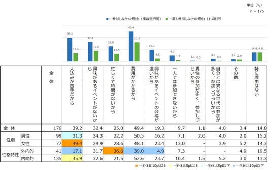 そして、性格特性別では、外向的な人と内向的な人で異なる傾向を発見した。どちらも「費用がかかるから」が1番高いが、2番目に高い理由が異なった。その理由は、外向的な人が「忙しくて時間がないから」、内向的な人が「人込みが苦手だから」となった。