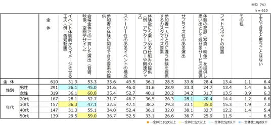 次に性別では、「参加者一人ひとりに違う体験を提供するカスタマイズ要素」、「その他」、「工夫できると思うことはない」以外は女性の選択率の方が高かった。特に差があった「会場全体での一貫した演出(音響、映像、空間デザイン)」は、約16ptも女性の方が高かった。