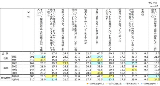 続いて、性格特性別では、内向的な人と比べ外向的な人の方が、「その他」と「イベント参加中または参加後にとった行動はない」以外が高かった。さらに、その中でも差があるのは、「イベント関連のサービスやコンテンツを購入・契約した(サブスクや映画チケットなど)」と「イベント主催者やイベント参加者のファンになった」の2つだった。