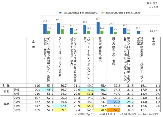 続いて年代別では、要素ごとに傾向が異なった。年代で差が見受けられるのは、「ストーリー性(テーマや世界観)」、「パフォーマーやスタッフのクオリティ」、「音楽や効果音の演出」、「周りの観客との一体感」、「テクノロジーを活用した演出(VR/AR、プロジェクションマッピング)」となった。これらの中でも特に差が大きい「周りの観客との一体感」は、30代の約29%が一番低く、50代の約53%が一番高かった。